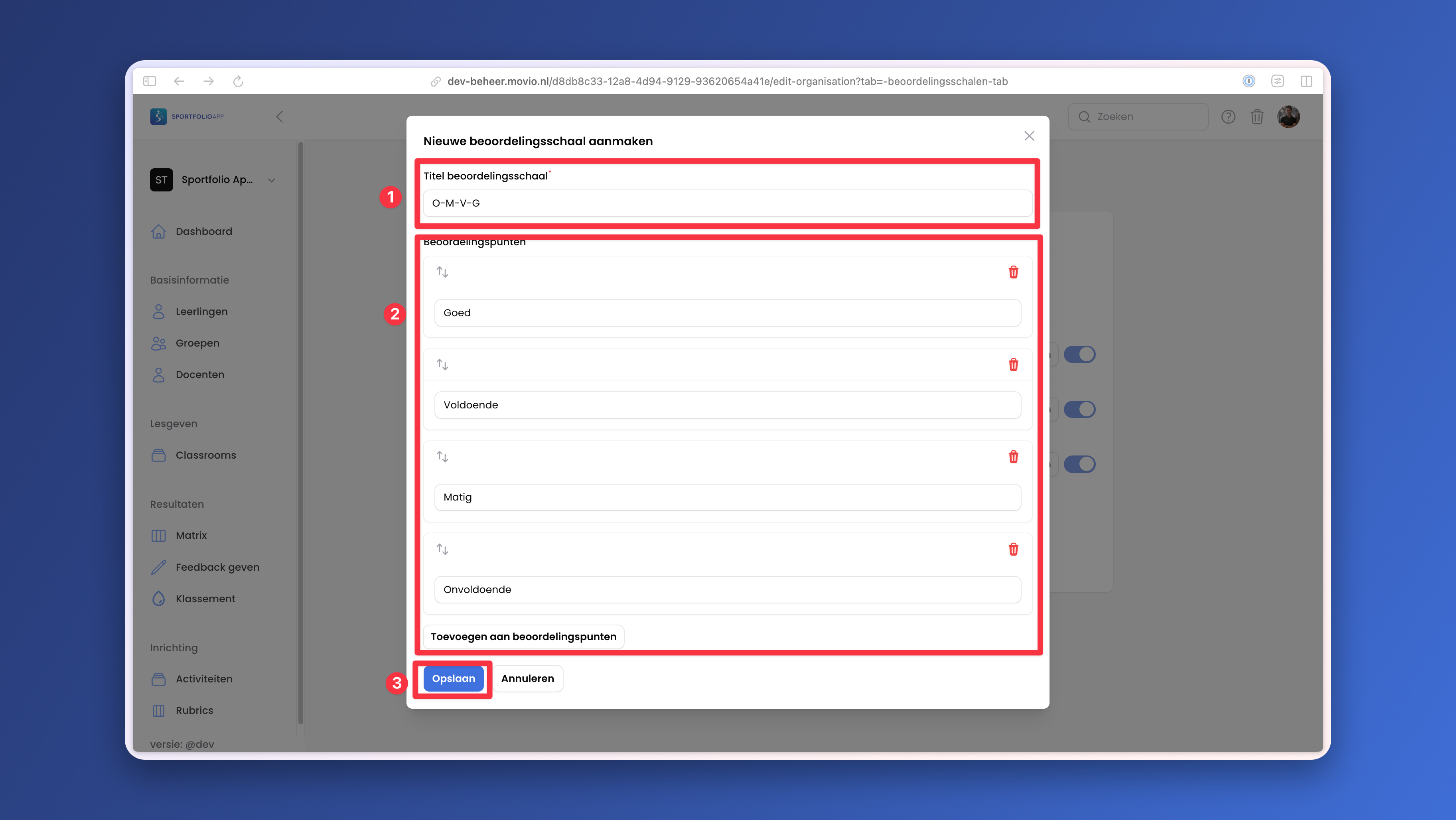 Als een van deze schalen voldoet aan jullie behoeften, hoef je geen eigen schaal aan te maken. Maar als jullie school bijvoorbeeld werkt met "Onvoldoende/Matig/Voldoende/Goed" of een andere indeling, dan kun je een eigen beoordelingsschaal aanmaken.